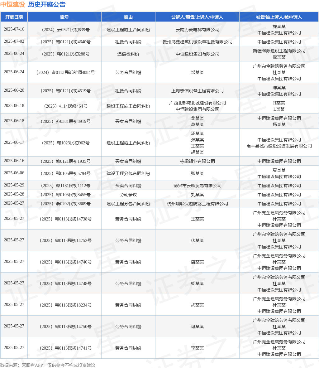 案号:(2025)浙0702民初3609号审理法院:金华市婺城区人民法院案由:建设工程分包合同纠纷当事人信息: 原告/上诉人:杭州翔联保温防腐工程有限公司 被告/被上诉人:中恒建设集团有限公司开庭日期:2025年5月27日根据统计,近一年内以中恒建设集团有限公司为当事人的历史开庭公告有341则,其中案由为“买卖合同纠纷”的公告以101则居首,其次为“建设工程施工合同纠纷”有61则,“劳务合同纠纷”有29则。历史开庭公告(前20条)如下: