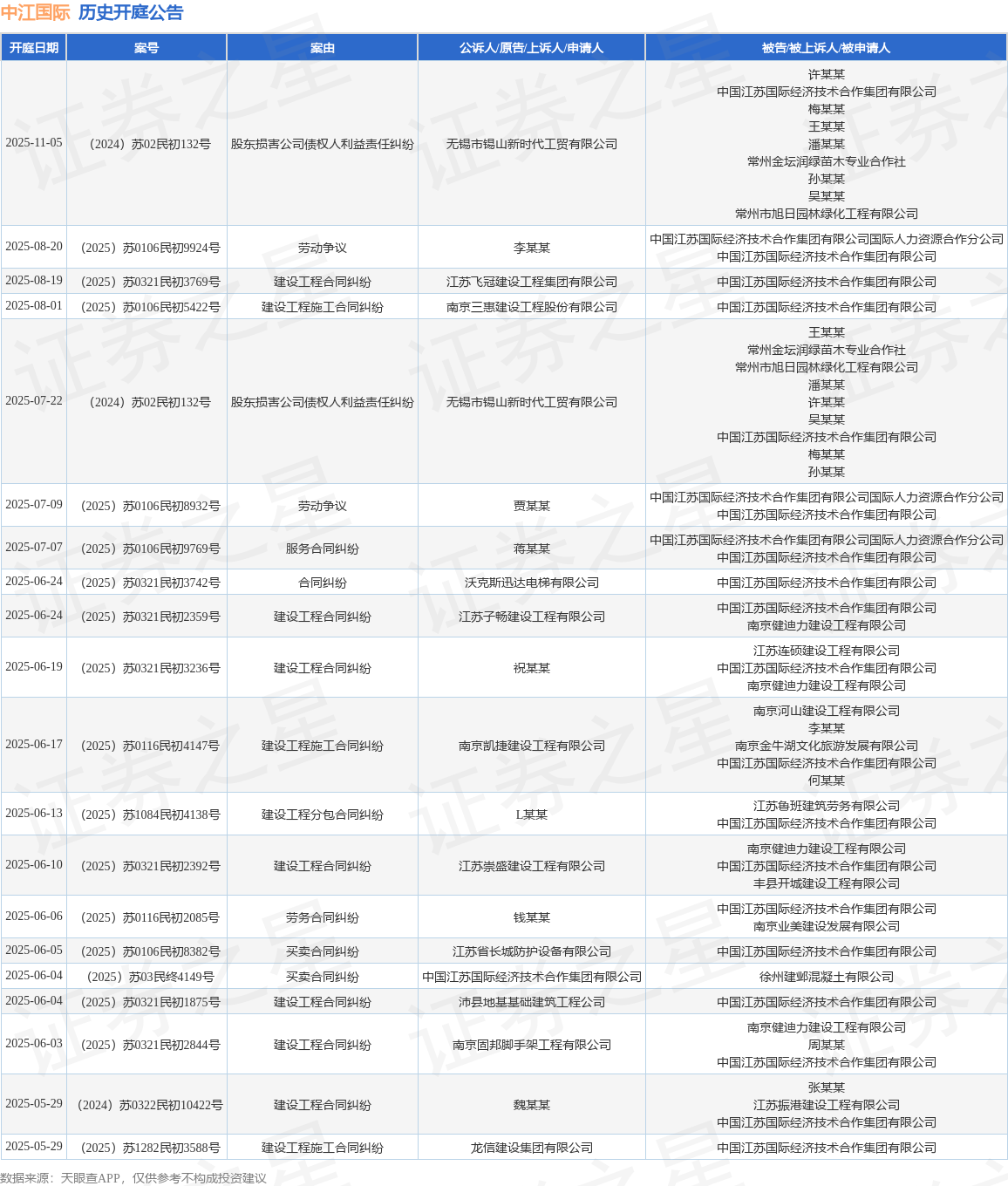 案号:(2025)苏0192民初7104号审理法院:南京江北新区人民法院案由:建设工程分包合同纠纷当事人信息: 原告/上诉人:刘某某 被告/被上诉人:江苏嘉振建设有限公司、中国江苏国际经济技术合作集团有限公司开庭日期:2025年5月27日根据统计,近一年内以中国江苏国际经济技术合作集团有限公司为当事人的历史开庭公告有199则,其中案由为“买卖合同纠纷”的公告以43则居首,其次为“建设工程施工合同纠纷”有29则,“建设工程合同纠纷”有26则。历史开庭公告(前20条)如下: